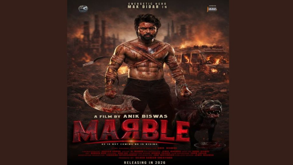 নির্মাতা অনিক বিশ্বাসের নতুন চলচ্চিত্র ‘মার্বেল’ এর অফিসিয়াল ফার্স্ট লুক পোস্টার প্রকাশ্যে এসেছে। গত ১৬ ডিসেম্বর আনুষ্ঠানিকভাবে সিনেমাটির টাইটেল ঘোষণা করা হয়। সেই ঘোষণার ধারাবাহিকতায় সম্প্রতি প্রকাশিত হয়েছে এর ফার্স্ট লুক। পোস্টারে দেখা গেছে, অভিনেতা ম্যাক দিদার রক্তমাখা সিক্সপ্যাক শরীর, ব্যান্ডেজ জড়ানো বুক, এক হাতে দেশীয় অস্ত্র এবং অন্য হাতে শিকলে বাঁধা একটি ভয়ংকর কুকুর। পুরো পোস্টারজুড়ে রয়েছে তীব্রতা, রুক্ষতা ও আক্রমণাত্মক এক ভিজ্যুয়াল ভাষা। এমন ব্যতিক্রমী কনসেপ্ট এর আগে খুব একটা দেখা যায়নি বলে মনে করছেন অনেকেই। পোস্টার দেখেই স্পষ্ট, ‘মার্বেল’ হতে যাচ্ছে অ্যাকশন ও ভায়োলেন্সে ভরপুর এক সিনেমা, যেখানে শক্তিশালী চরিত্র ও ভিজ্যুয়াল প্রেজেন্টেশনই মূল আকর্ষণ। নির্মাতা অনিক বিশ্বাস জানিয়েছেন, চলতি মাসের ২০ তারিখ থেকেই সিনেমাটির শুটিং শুরু হবে। কাস্টিংয়ে আরও কারা থাকছেন, সে বিষয়ে তিনি আপাতত মুখ খুলছেন না; তবে খুব শিগগিরই অফিসিয়াল ঘোষণার আশ্বাস দিয়েছেন। উল্লেখযোগ্য বিষয় হলো, ‘মার্বেল’ সিনেমার গল্প, সংলাপ ও চিত্রনাট্য-সবকিছুই লিখেছেন অনিক বিশ্বাস নিজে। সিনেমাটি প্রযোজনা করছে সিলভার স্ক্রিন ক্রিয়েশনস।